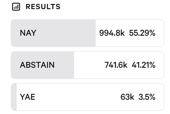The Snapshot poll closed on Friday with a clear rejection. Most voters said no, while a large share abstained. Final results showed 55.29% voted against the proposal. Another 41.21% abstained, and only 3.5% voted in favor.