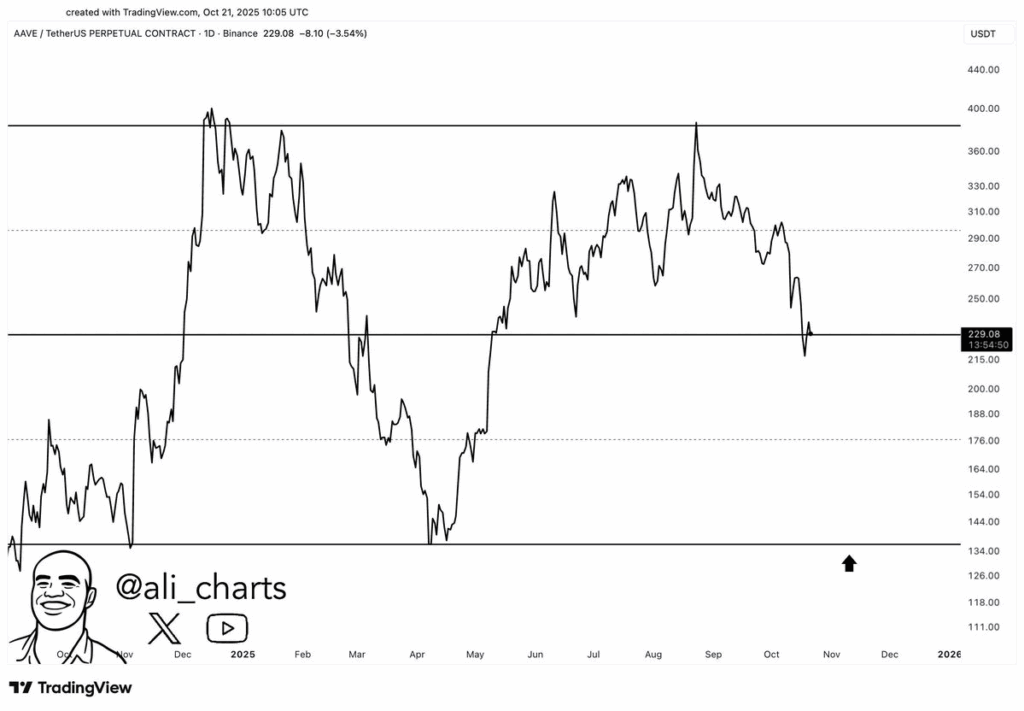 Recent data from analyst Ali Martinez indicates that AAVE’s current price action exhibits a clear bearish structure, as the token struggles to maintain above the $230 support zone.