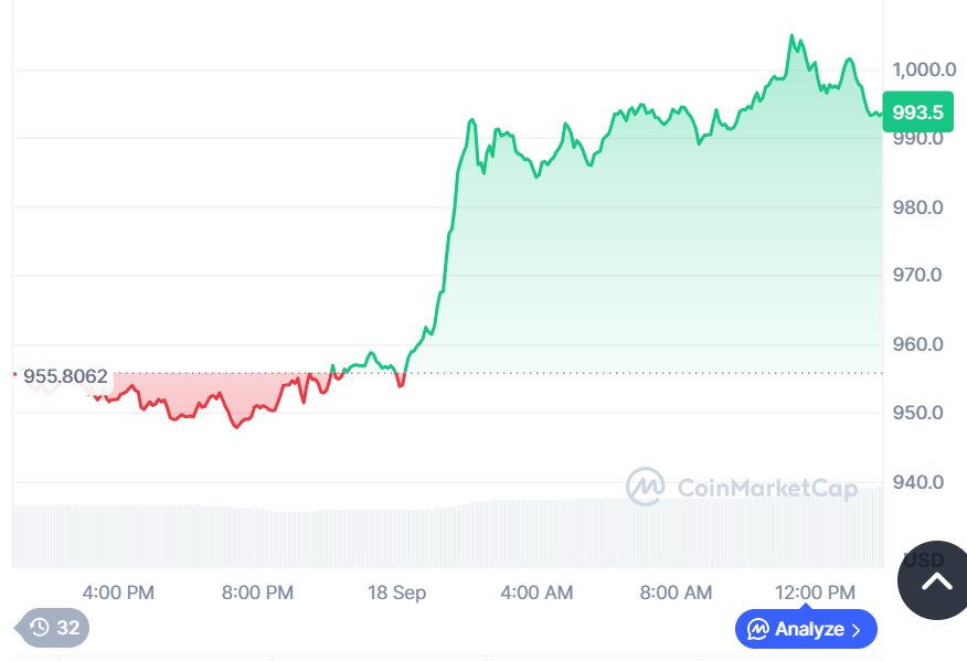 BNB’s price rose to $1,000 following weeks of steady growth. After consolidating between $550 and $750, the token began to show strong bullish signals. Since June 2025, its price has climbed from $626 to the landmark $1,000 level.