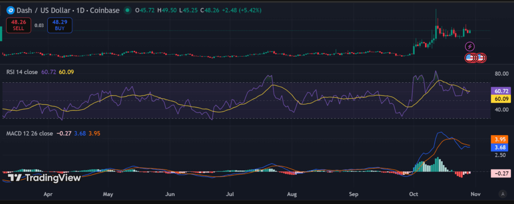 Dash has traded mostly sideways with notable volatility, dropping to around $46 before rebounding sharply toward the $49 mark.