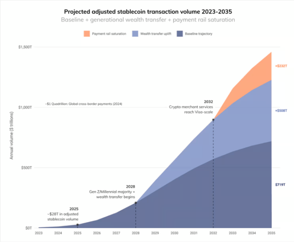 The latest Chainalysis report shows stablecoins processes $28 trillion in real economic volume in 2025. That indicates a 133% compound annual growth rate since 2023. Meanwhile, analysis expects this figure to hit $1.5 quadrillion by 2035. And that would mean eclipsing the existing entire cross-border settlement market.