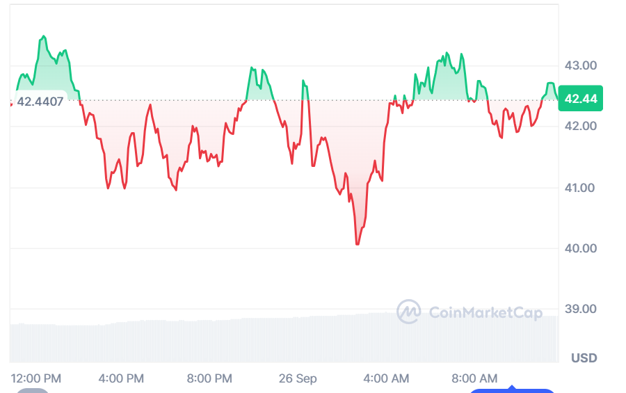 As of this writing, Hyperliquid is trading at around $42.44 with a 24-hour loss of 0.74%.