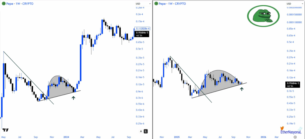 As per analyst EᴛʜᴇʀNᴀꜱʏᴏɴᴀL on X, Pepe appears to be entering a phase similar to the one that preceded its last major breakout.
