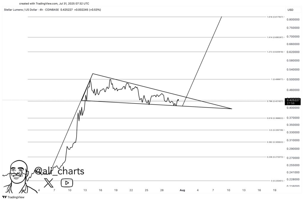 XLM briefly touched $0.46 after rising from $0.22 during July and is currently consolidating in a bullish flag pattern that is said to have significant potential for another explosive rise. On-chain analyst Ali Martinez observes that if the price breaks through $0.50, the next target is in the $0.62 to $0.80 range.