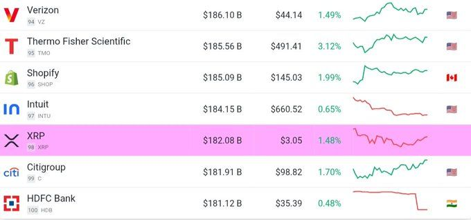Both institutional and retail inflows have fueled this climb, driving XRP ahead of well-known global corporations such as Verizon, Texas Instruments, and Citigroup.