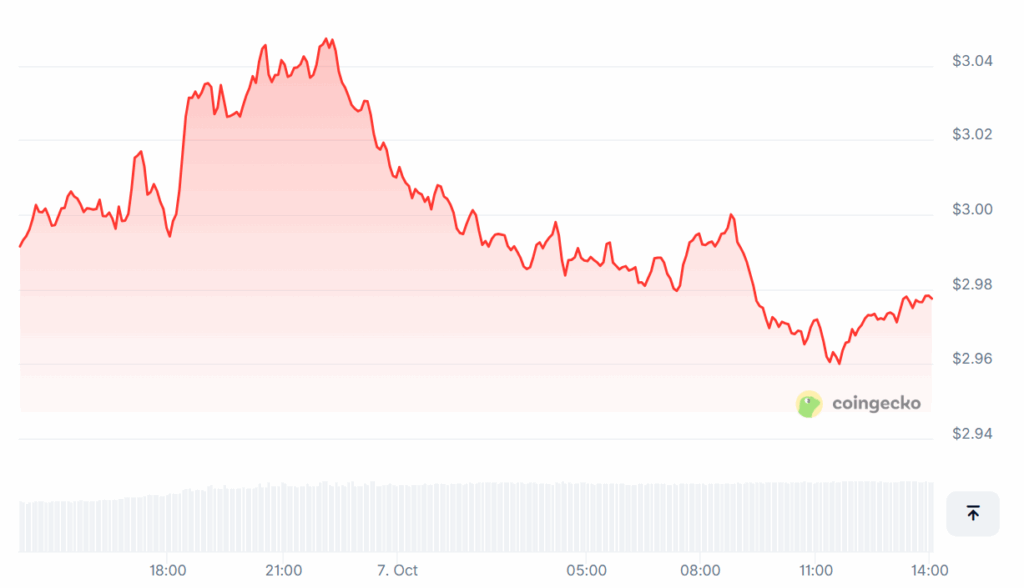 The cryptocurrency has faced resistance near $3.04 and found support around $2.95, where buyers started to stabilize the price.